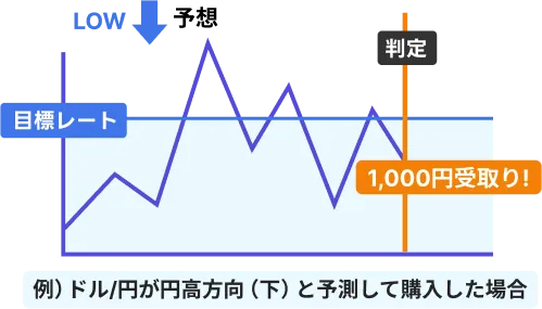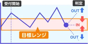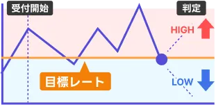 バイナリーオプションとはある一定期間で為替レートが設定された目標レートを上回っているか、下回っているかを予測する取引です。